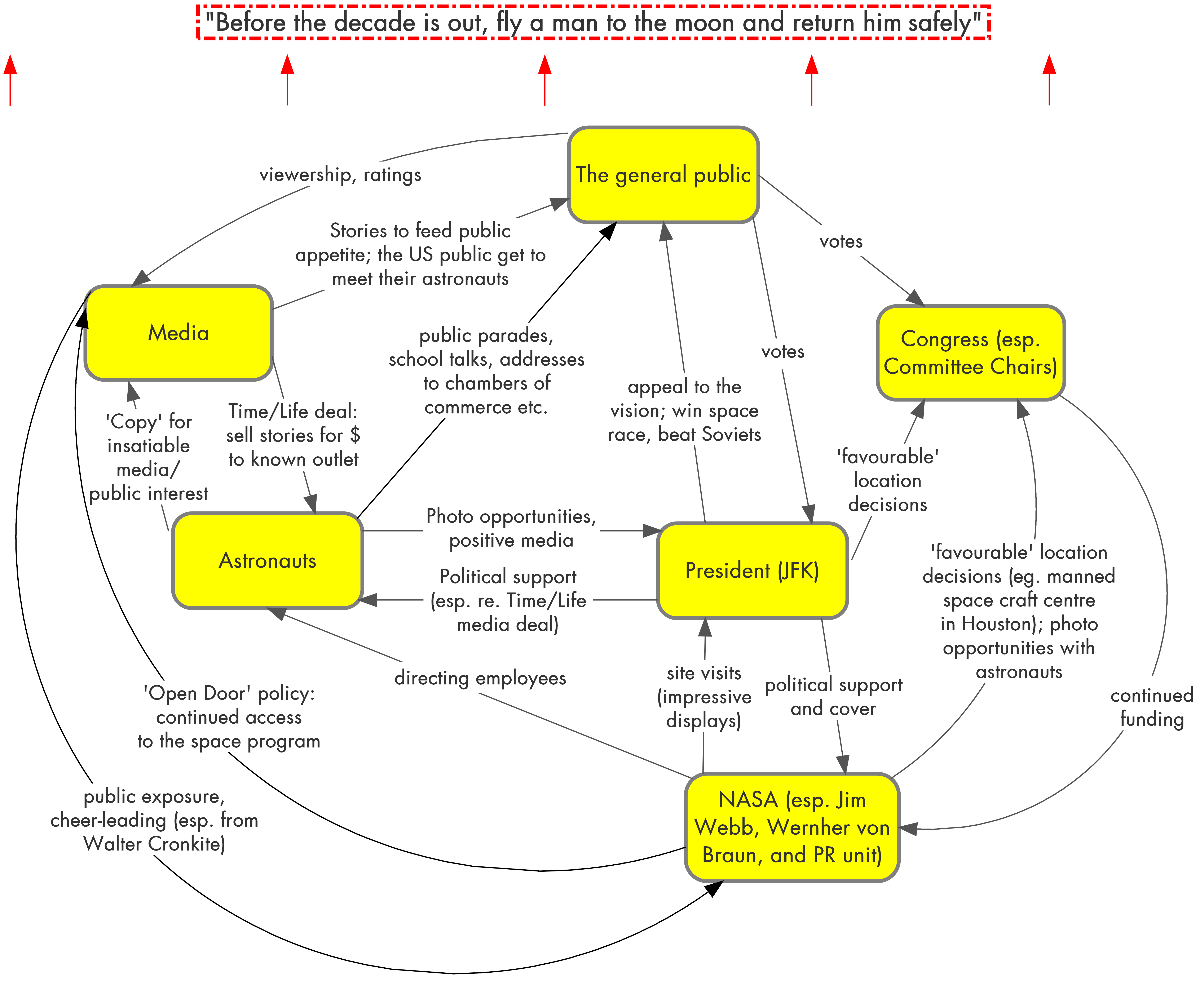 The diagram below is my depiction of the various stakeholders and their ‘leverage points’ in the early years of the space program. Note the array of incentives and the often two-way movement of pressure and benefits: