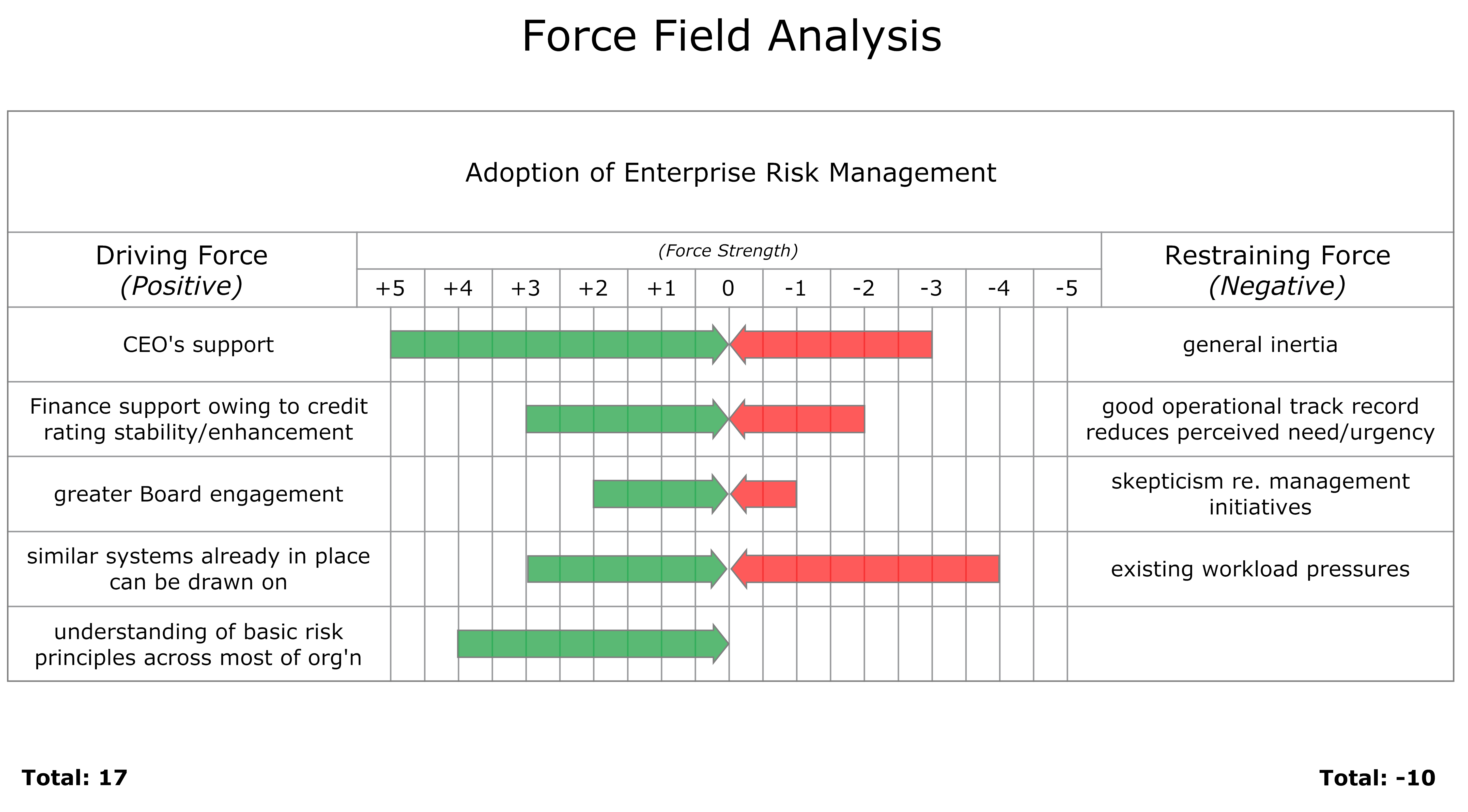 Another powerful use for the Force Field Analysis is that it highlights where action can be directed to further stack the deck in favour of success. In this case, existing staff workloads might be examined and re-prioritised, and the CEO and CFO might craft a message to all staff highlighting the importance and benefits of an ERM program and how staff can gain from it (enhanced ability to deal with policy or economic shocks and hence greater job certainty, new job opportunities emerging in the risk area etc.).