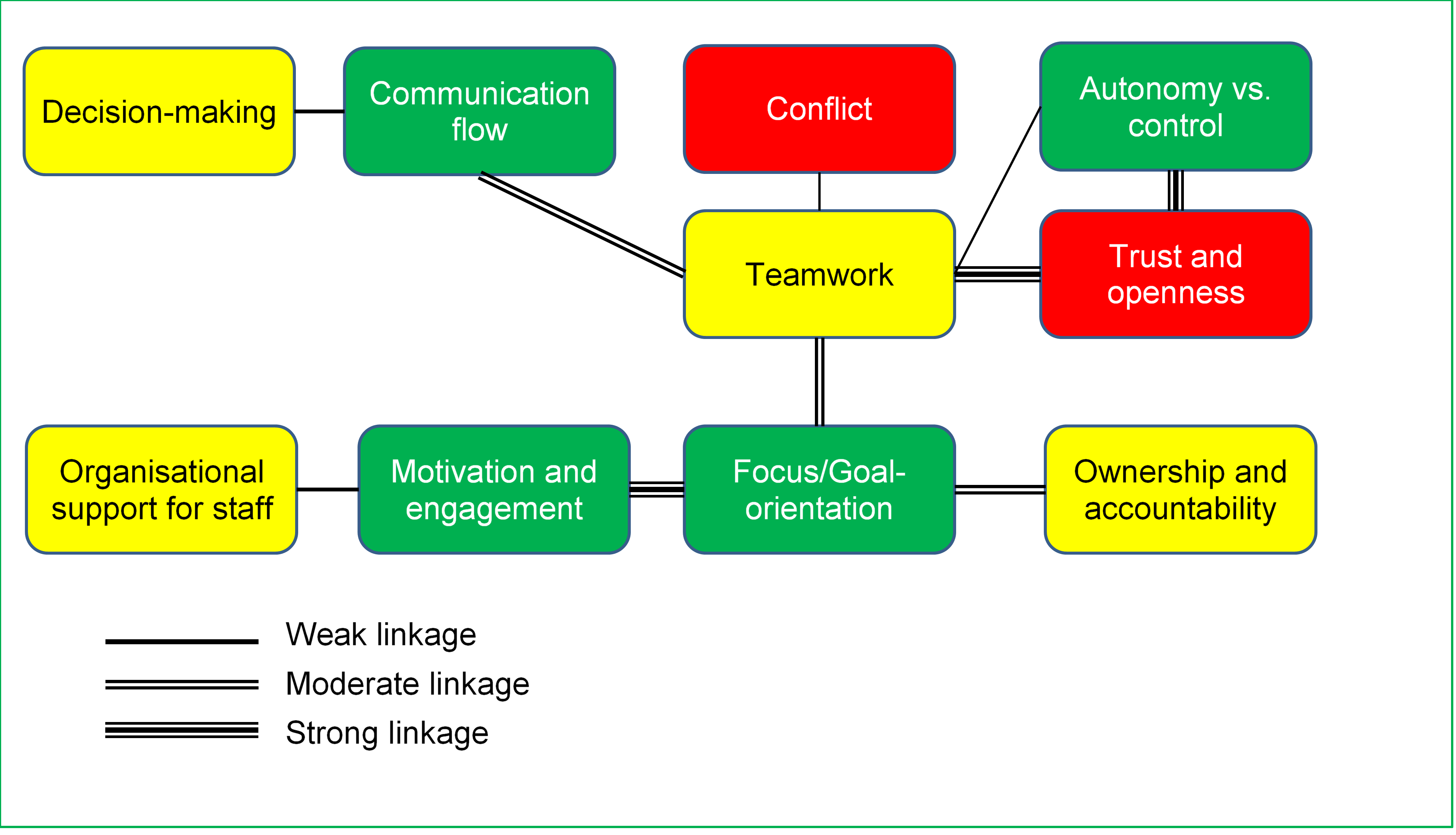 This kind of diagram shows the critical ‘nodes’ in the network of attributes that make up an organisation’s culture. With these identified we start to get an idea where to focus efforts to improve culture. In the example above, Teamwork and Focus/Goal Orientation are principal nodes so these make sensible starting points for efforts to improve culture.