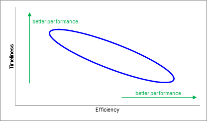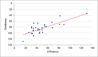 Another example: in October I analysed the performance of 31 Sydney councils in processing development applications (DAs) comparing their timeliness with their efficiency. Without looking at the data, you would have expected a trade-off between timeliness and efficiency: that the fastest councils 'bought' their timeliness at the expense of efficiency by putting on more staff to churn through the DAs. Plotting this graphically you would expect to see a pattern where better timeliness was associated with worse efficiency, and vice versa, like this: