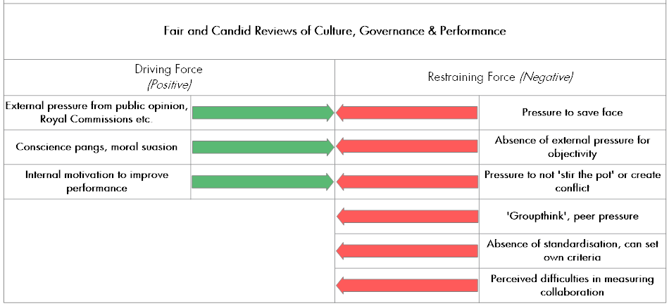 There are many factors weighing against fair and candid reviews of culture and governance, more I would suggest, than those weighing for it, which I summarise in the force-field diagram below: