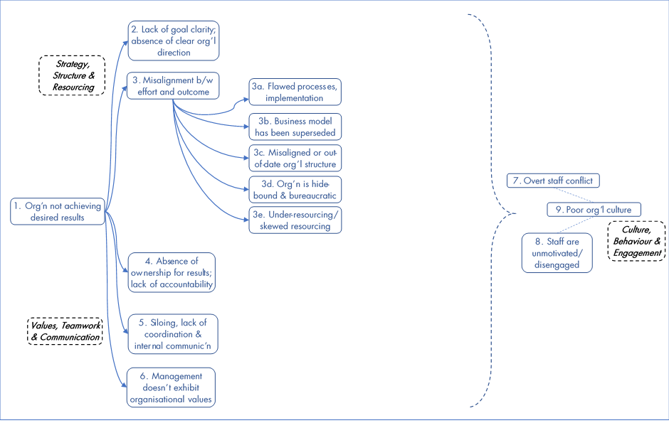 There are other possible causes of the organisation not accomplishing its desired results: there could be problems in the areas of Values, Teamwork & Communication (numbers 4 to 6) or Culture, Behaviour & Engagement (numbers 7 to 9). We’ll deal with those in future newsletters.