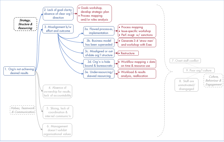- If the organisation has an absence of process, or its implementation is wanting (item 3a) I recommend process mapping to develop and agree these. As is often the case, undertaking this as a collaborative effort will both accelerate the development of, and agreement to, such processes. Relatedly, an issue-specific workshop to resolve particular blockages, if it involves representatives from all affected divisions, is another useful means of improving implementation. If implementation is falling down because individuals are not performing or are not being held accountable for their results, putting a formal performance management system in place may be the order of the day.