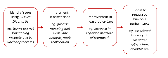 The results of that analysis would enable a manager to say, for example, that a three percent increase in reported Teamwork, Conflict & Trust in the Culture Diagnostic was associated with a five percent boost to customer satisfaction which was in turn associated with a two-and-a-half percent boost in revenue (these figures are illustrative only). That boost to revenue might amount to an extra half a million dollars (say) which would likely exceed the cost of the culture improvement intervention by many orders of magnitude. The whole scenario would look something like the below:
