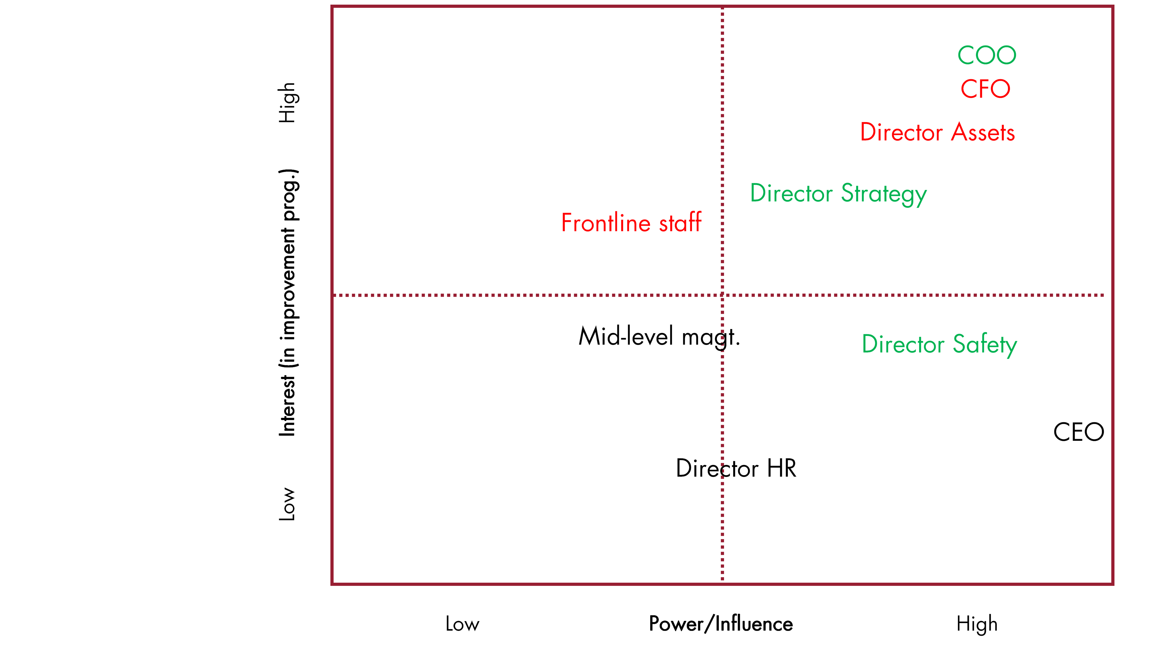The COO is high in organisational influence and, as the driver of the improvement initiative, is high in interest: she is committed to the change and wants it to succeed. It’s her baby.