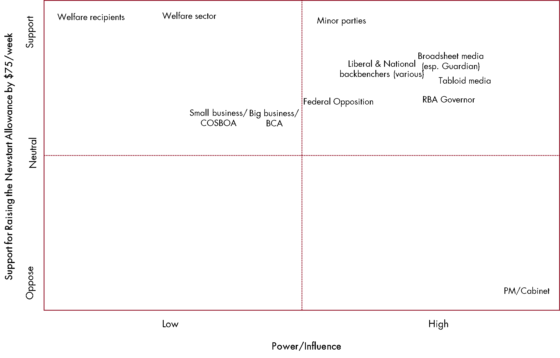 The really striking feature of this power map is that, apart from the PM and Cabinet, there is no opposition! Every other player is ‘above the line’ providing support in varying degrees to the Newstart increase: it is only Cabinet which is holding out against a broad array of stakeholders from business, politics, the media and the welfare sector. This in itself is instructive for the proponents of the campaign; it’s useful to know because it means subsequent efforts should focus on marshalling the support which is already there, rather than drumming it up.