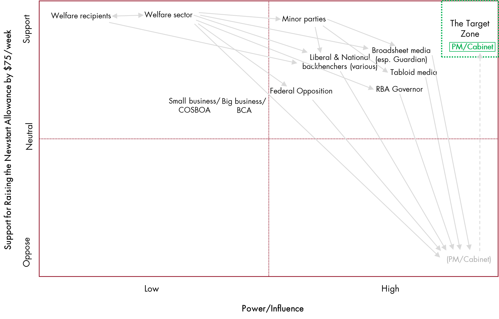 The ultimate goal is obviously to move the PM and Cabinet to a position of support for the Newstart increase. The map below depicts this, along with a plausible set of influences to be marshalled to that effect: