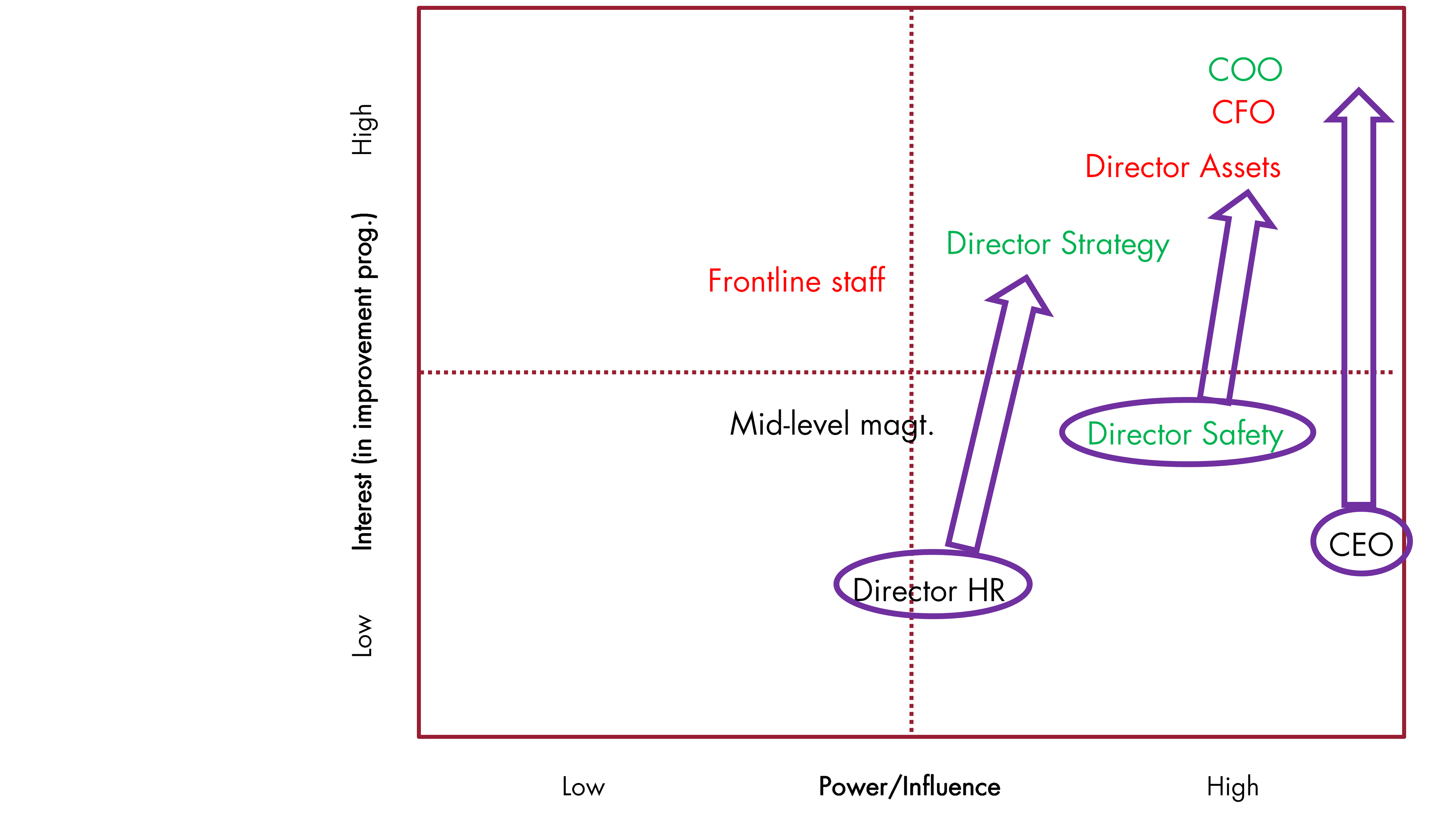 And so, to return to our hypothetical case study from last month. Recall that the Chief Operating Officer (COO) aims to introduce a program to drive improvements in processes in order to meet a new international quality standard. The CEO only has passing interest in the initiative at present as he is preoccupied with a range of other issues. The Director Safety is broadly supportive since the initiative will improve her KPIs, but she is not engaged at the moment. The HR Director is basically neutral and has not engaged with the initiative to date.