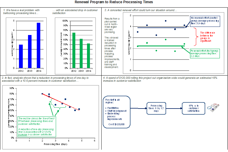 Here’s what a business case or funding bid could look like in the mocked-up example of a renewal effort for a service organisation, with all of the elements fit onto one page (into what I term a ‘manganomic’):