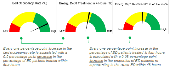 • there is indeed a relationship between bed occupancy and ED waiting times: every one percentage point increase in bed occupancy is associated with a 0.5 percentage point decline in the proportion of ED patients treated within four hours (in other words, more emergency patients have to wait longer)