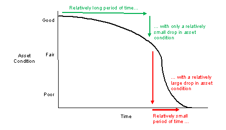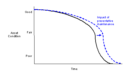 Towards the end of its life, the worsened rate of deterioration means that costs to rehabilitate or renew the asset are much higher. Preventative maintenance forestalls this deterioration; it slows the effect of time: